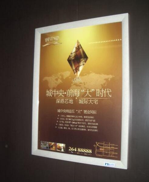 電梯框架廣告為靜態直至畫面, 24小時不間斷播出一個廣告畫面、由于電梯轎廂內是封閉的環境、廣告到達率比較高、樓盤覆蓋一般社區為主、寫字樓為輔。