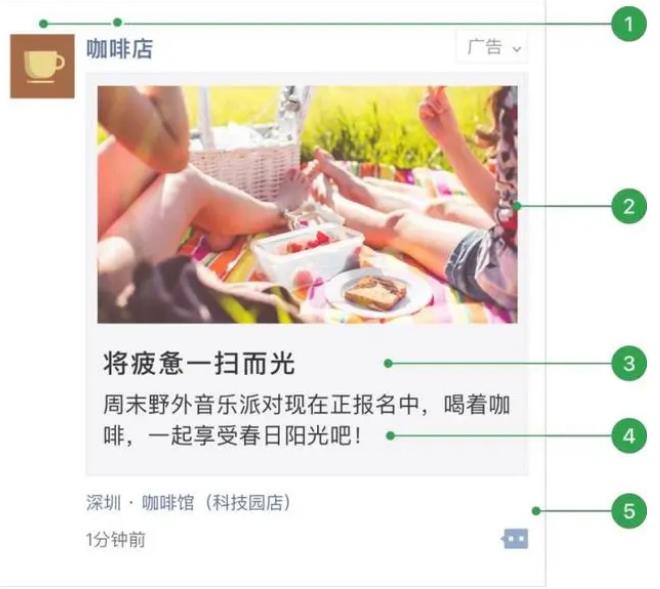 1. 廣告主頭像昵稱:用戶點(diǎn)擊可直接跳轉(zhuǎn)廣告主公眾號(hào)介紹頁(yè);2. 外層圖片、小視頻;3. 外層文案標(biāo)題(可選);