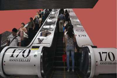 地鐵扶梯產(chǎn)品形式:分布在地鐵出入站口及站內(nèi)通道,扶梯面板巨幅畫面,適合展示品牌形象,完美詮釋產(chǎn)品功能訴求;扶梯扶手帶跟隨受眾移動,不可比擬的廣告親和距離。