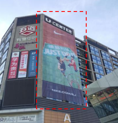 媒體位置: 五道口購物中心 媒體形式:墻面掛布 媒體尺寸:總面積 :738.09m² (41.7m高*17.7m寬)
